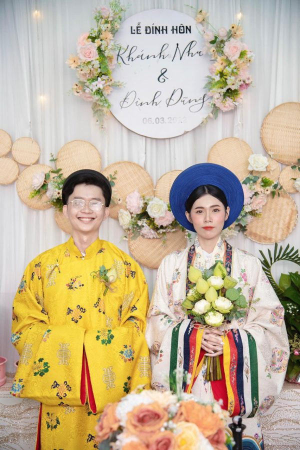 MÃ THUÊ NB14-G12A: NHẬT BÌNH SA NHŨ HOA MÀU TRẮNG – ÁO TẤC XANH THAN LÓT ĐEN ÉP NHŨ HOA VĂN CHỮ THỌ