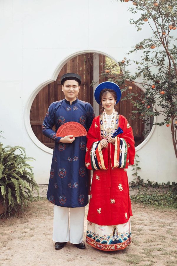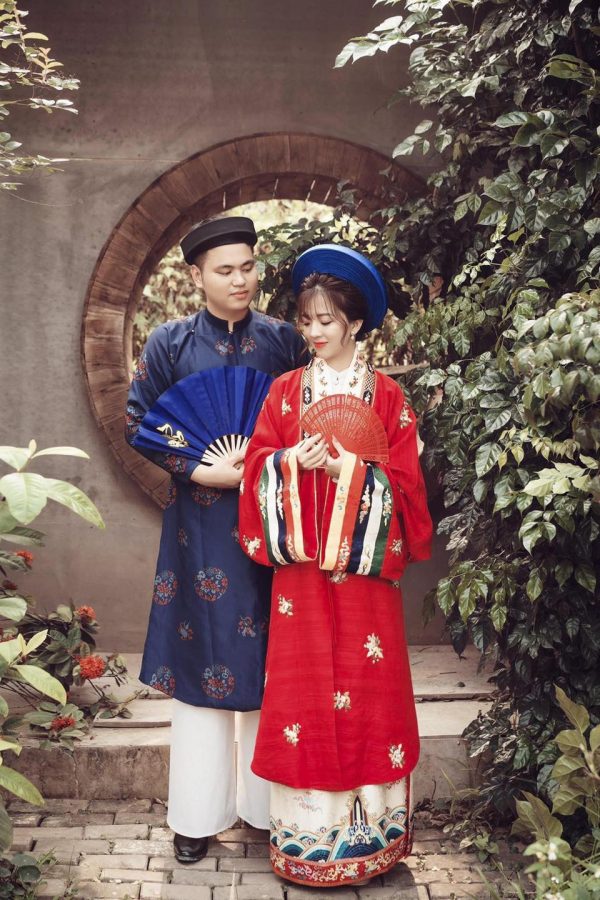 MÃ THUÊ NBT-G19: NHẬT BÌNH THÊU CAO CẤP MÀU ĐỎ – ÁO TAY CHẼN XANH THAN ĐẬM VẢI TAFTA IN HOA VĂN