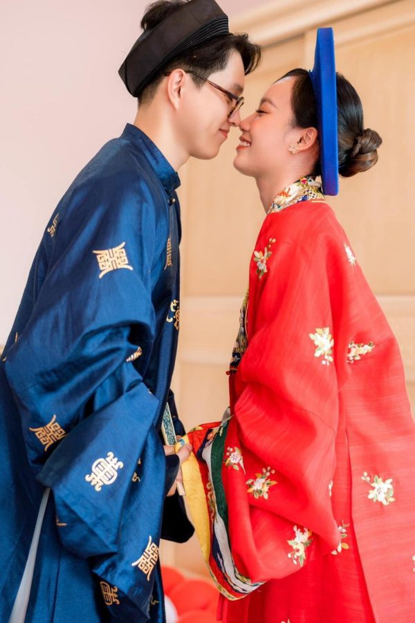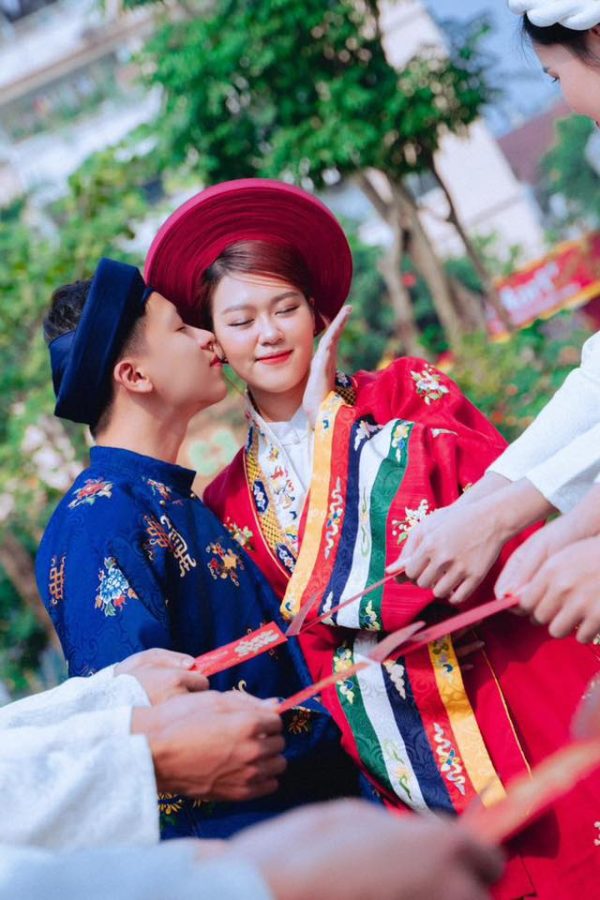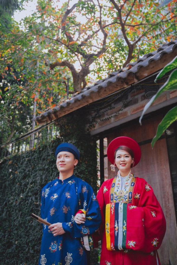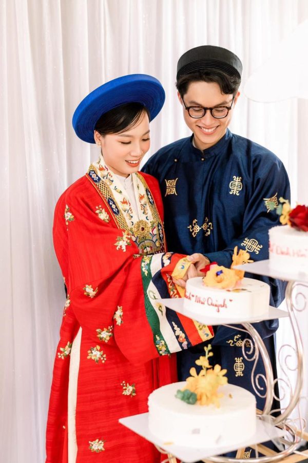 MÃ THUÊ NBT-G12: NHẬT BÌNH THÊU CAO CẤP MÀU ĐỎ – ÁO TẤC XANH THAN ÉP NHŨ
