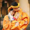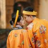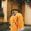 – Áo Nhật Bình màu vàng cam vải sa hàn, thêu họa tiết cực kỳ sang trọng