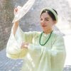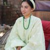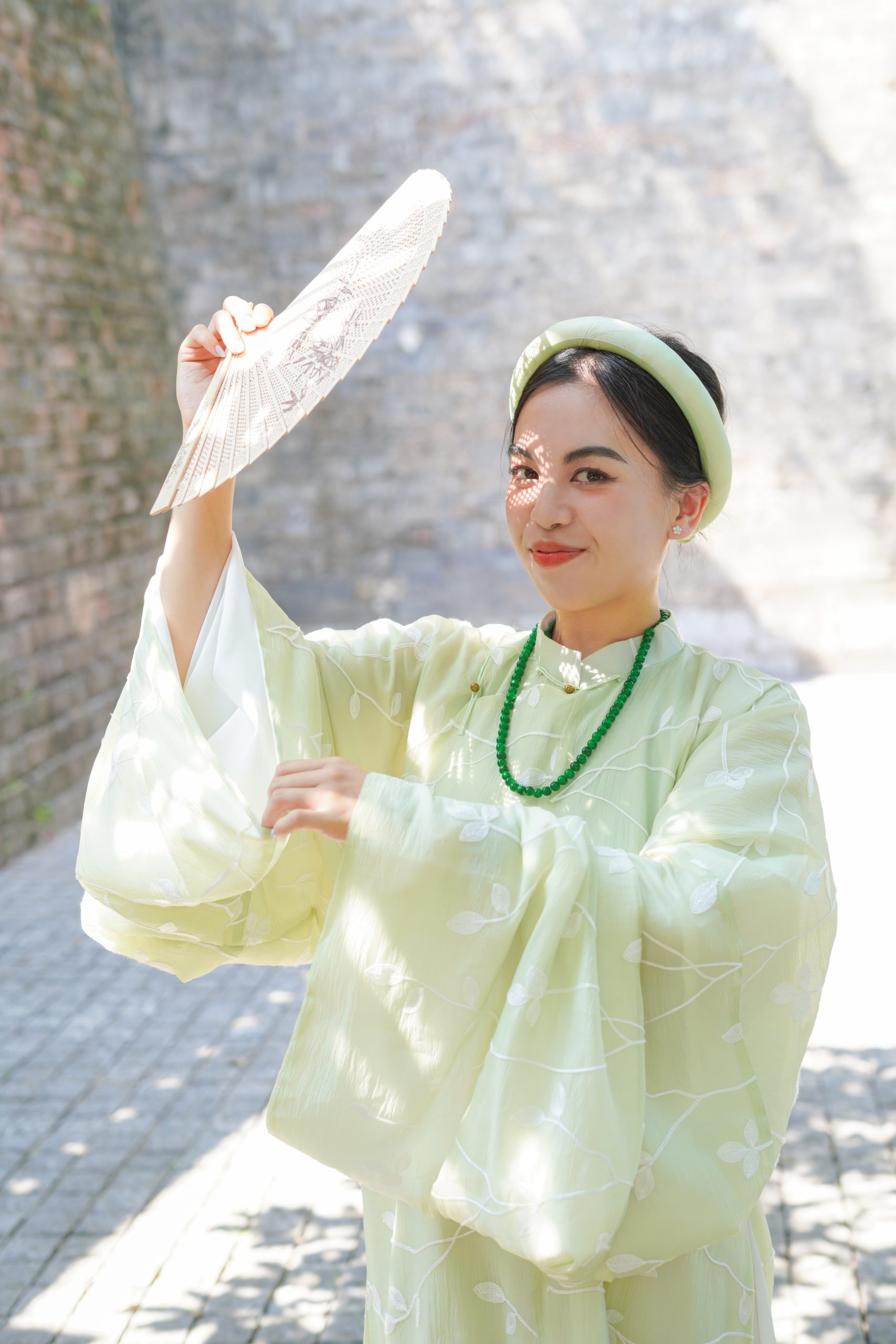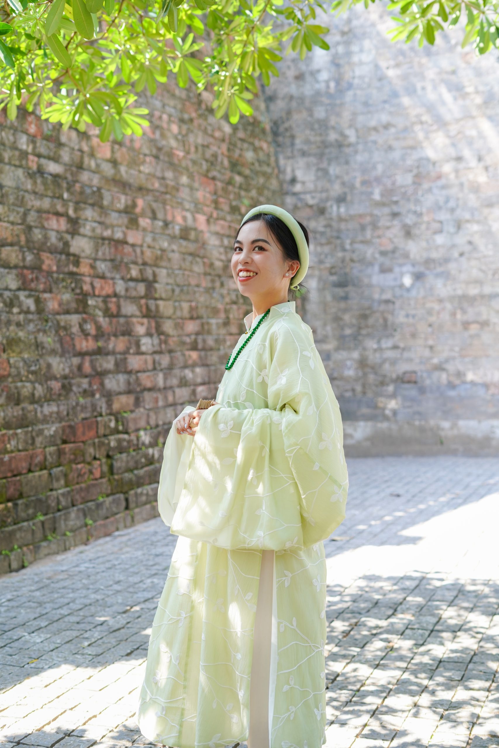 – Áo Tấc vải tơ kim màu xanh lá, thêu hoa trắng