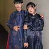 – Áo Ngũ thân tay chẽn vải tafta in hoa văn chìm nền xanh than đậm