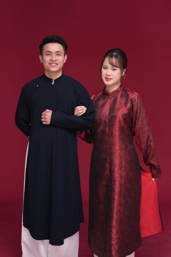 – Áo Nhật Bình màu đỏ vải gấm in hoa văn chìm