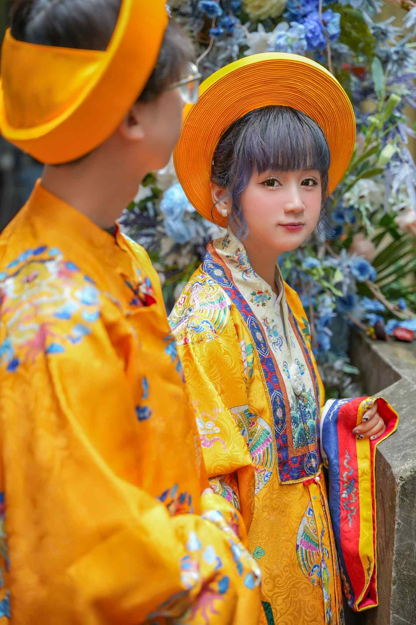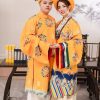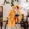 – Áo Nhật Bình vàng cam vải gấm in hoa văn chìm