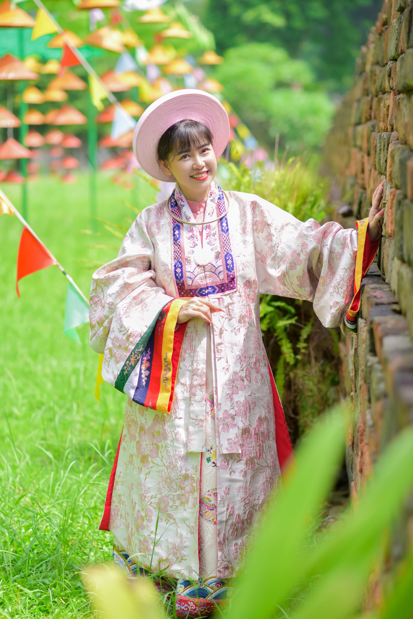 MÃ THUÊ NB23-G11: NHẬT BÌNH GẤM HOA MÀU HỒNG PASTEL – ÁO TẤC ĐOÀN LONG VÀNG CAM
