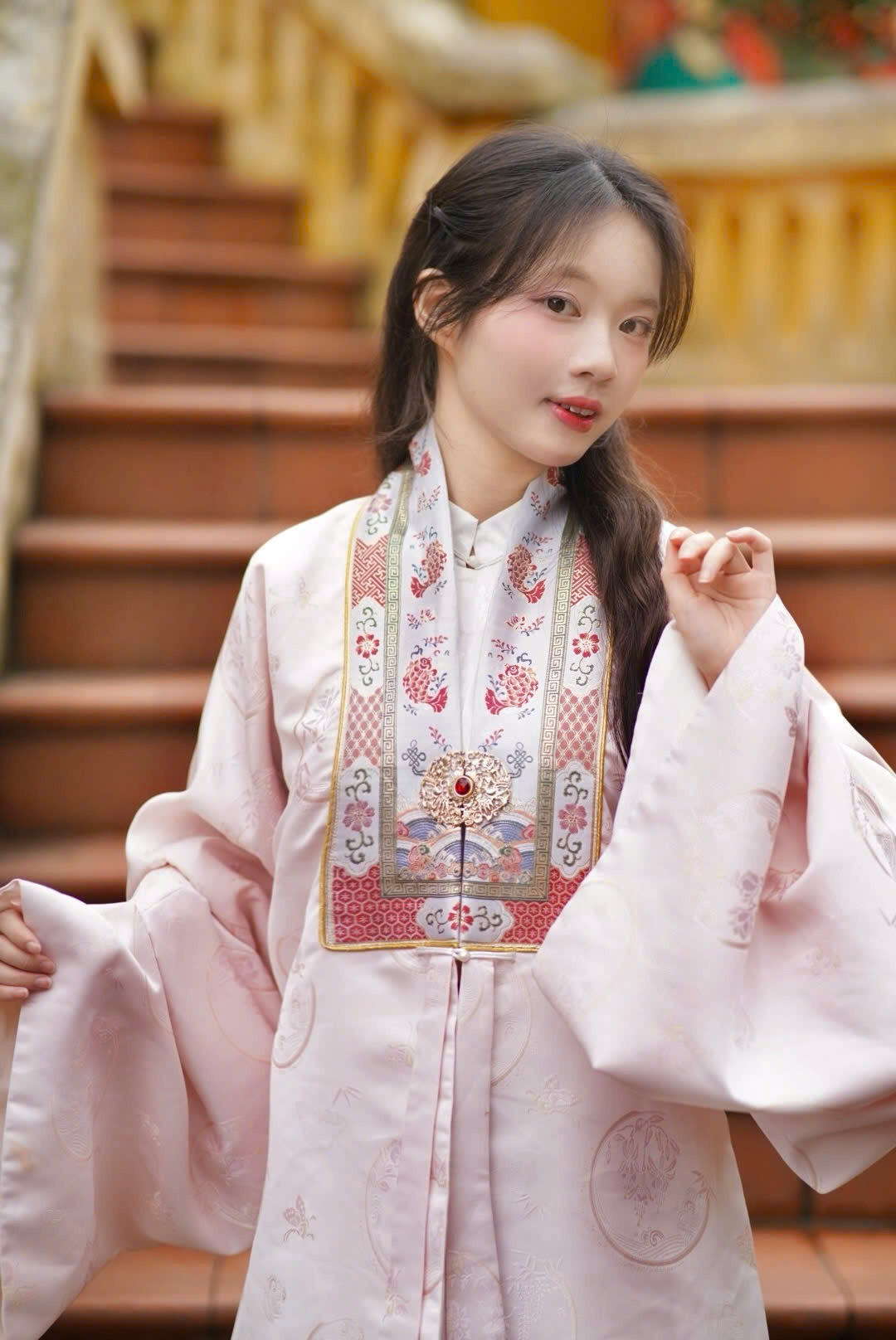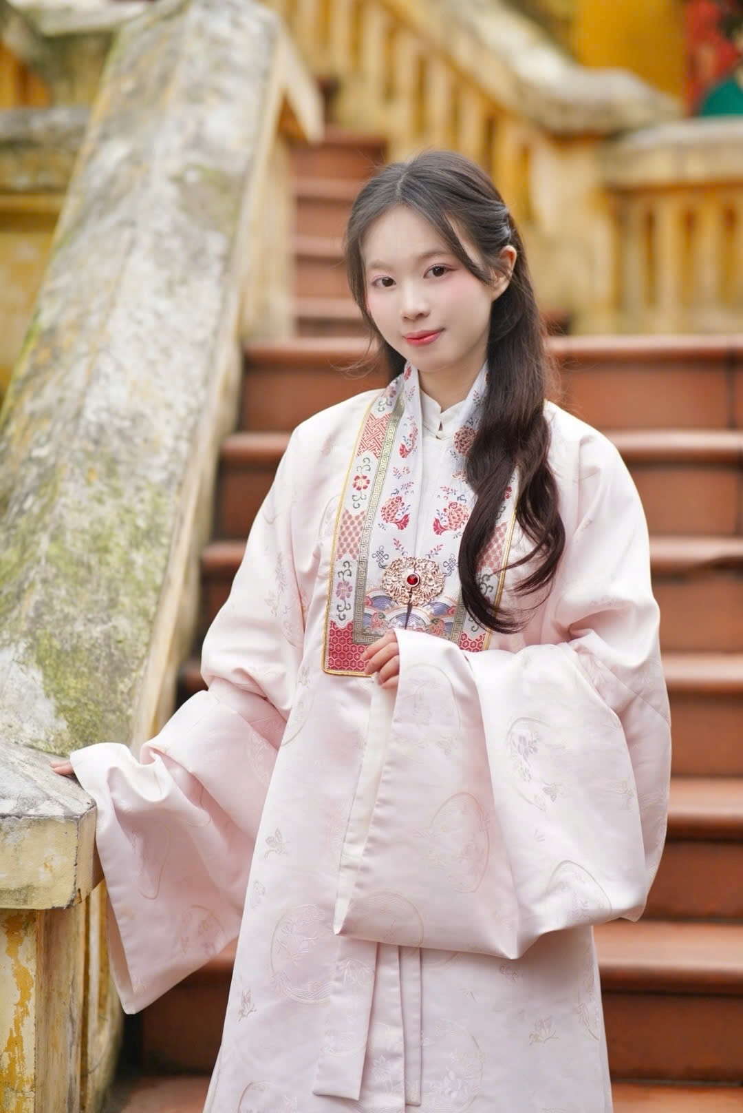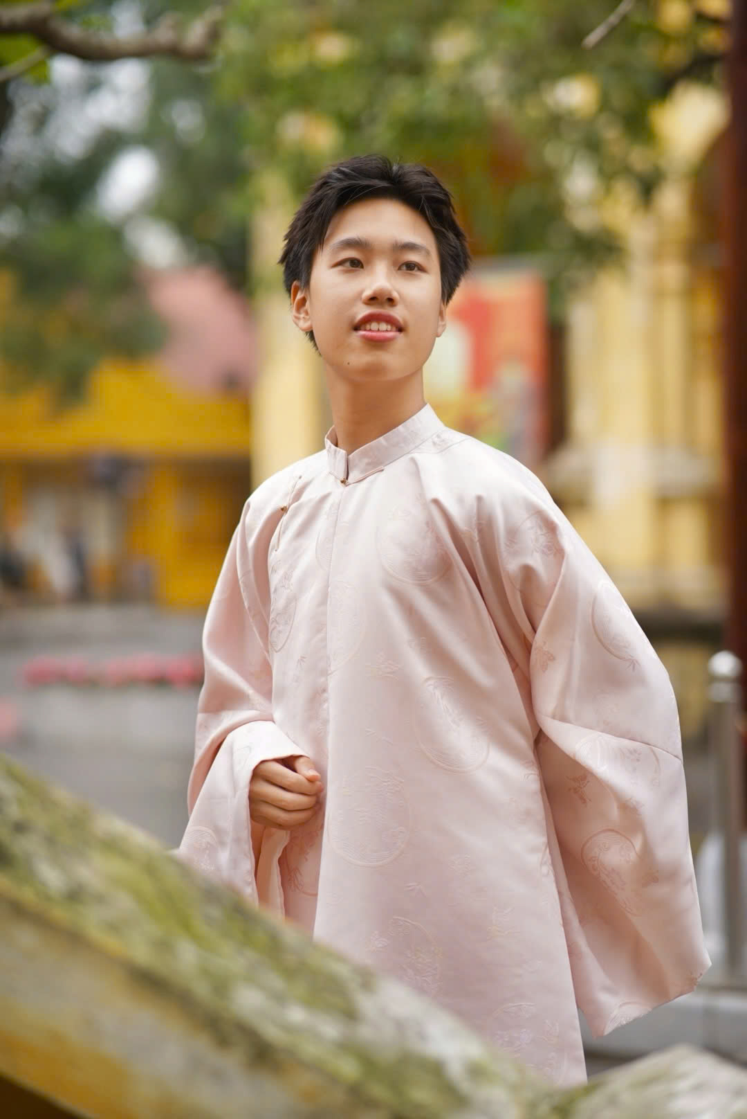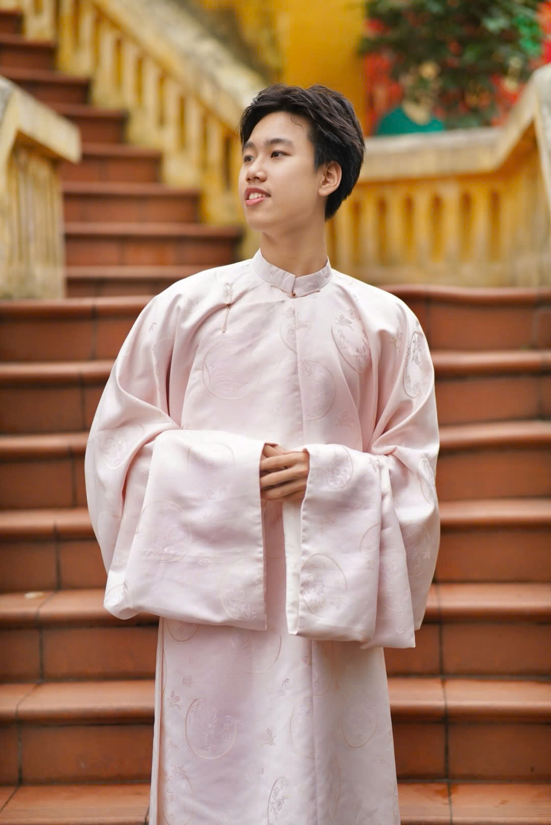 – Áo Nhật bình vải gấm Nguyệt Hoa màu hồng – cổ dệt lý ngư với hoa văn thiết kế độc quyền, concept đặc biệt, trên chất vải sang trọng
