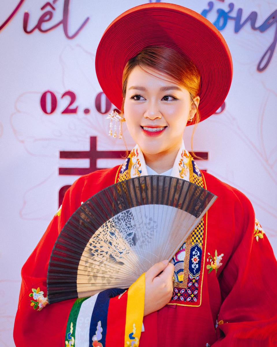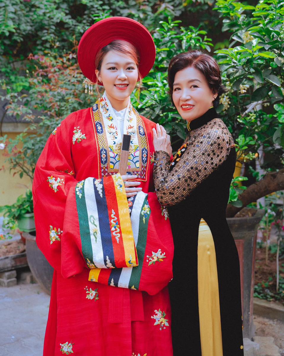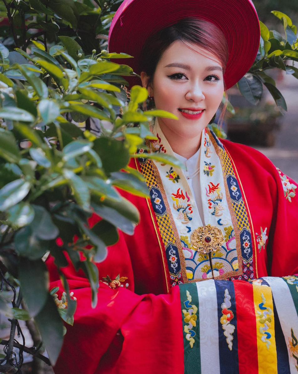 – Áo Nhật Bình màu đỏ vải sa hàn, thêu họa tiết cực kỳ sang trọng